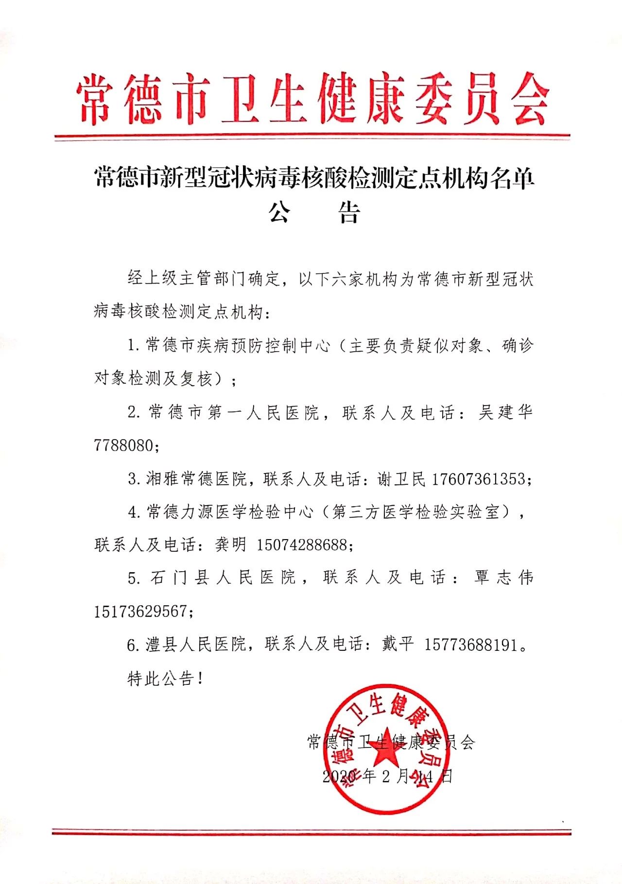 经上级主管部门确定,以下六家机构为常德市新型冠状病毒核酸检测定点机构: