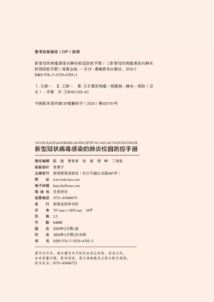 记者从湖南省科协了解到,《新型冠状病毒感染的肺炎校园防控手册》(电子版)今天发布。据悉,这是国内首本面向校园的新型冠状病毒感染的肺炎防控手册,近日还将出版纸质书和用于校内广播的音频光盘,免费发放至全省各中小学校,帮助青少年正确面对疫情、提升防控意识、养成良好习惯。