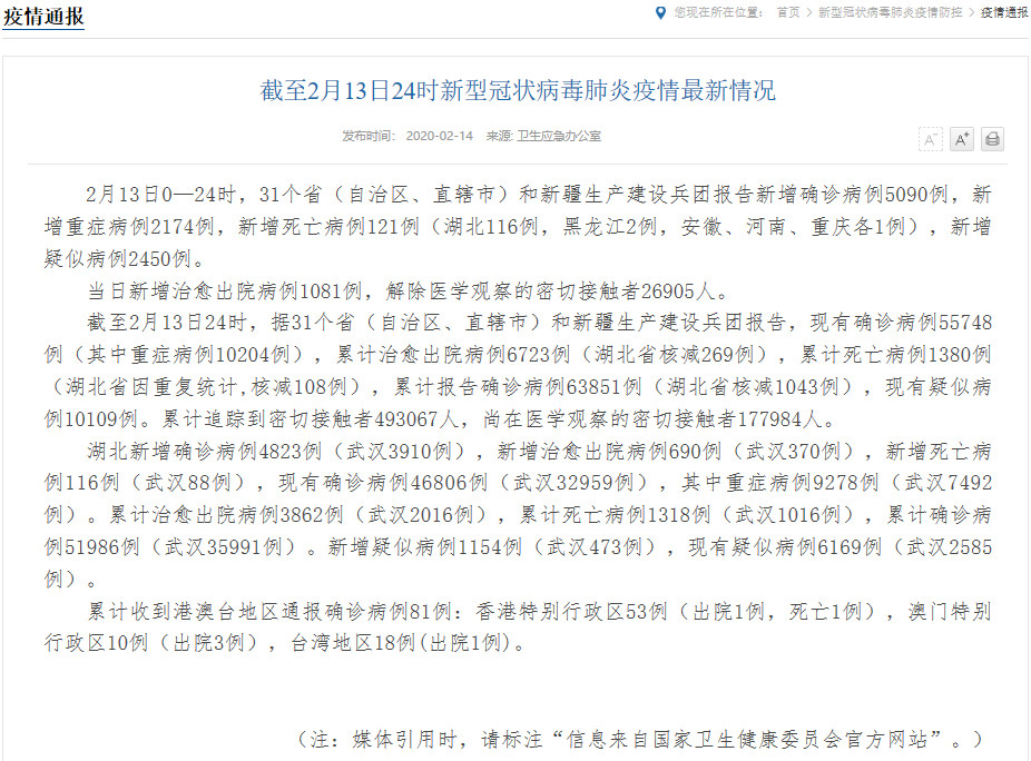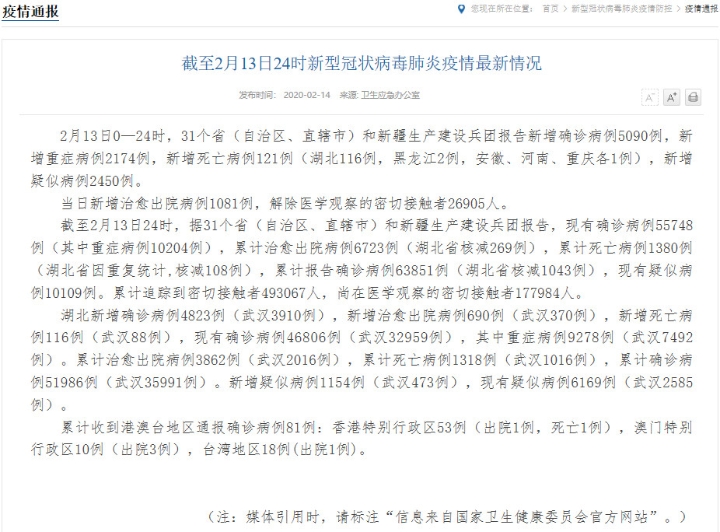 截至2月13日24时,据31个省(自治区、直辖市)和新疆生产建设兵团报告,现有确诊病例55748例(其中重症病例10204例),累计治愈出院病例6723例(湖北省核减269例),累计死亡病例1380例(湖北省因重复统计,核减108例),累计报告确诊病例63851例(湖北省核减1043例),现有疑似病例10109例。累计追踪到密切接触者493067人,尚在医学观察的密切接触者177984人。