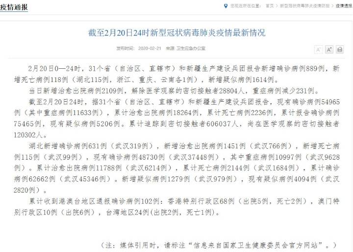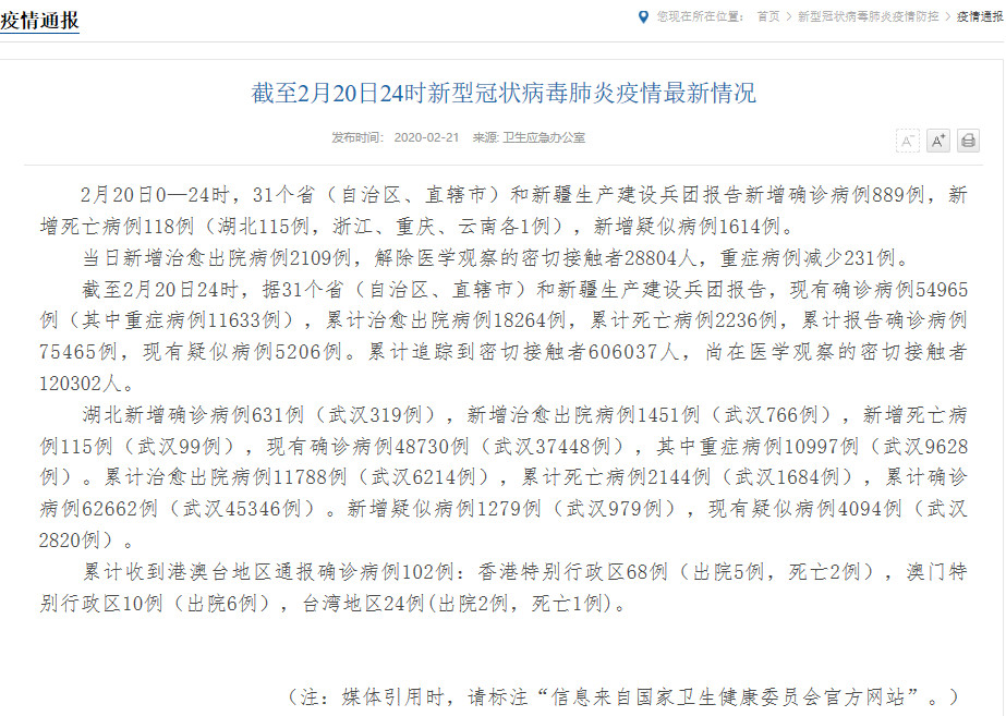 截至2月20日24时,据31个省(自治区、直辖市)和新疆生产建设兵团报告,现有确诊病例54965例(其中重症病例11633例),累计治愈出院病例18264例,累计死亡病例2236例,累计报告确诊病例75465例,现有疑似病例5206例。累计追踪到密切接触者606037人,尚在医学观察的密切接触者120302人。