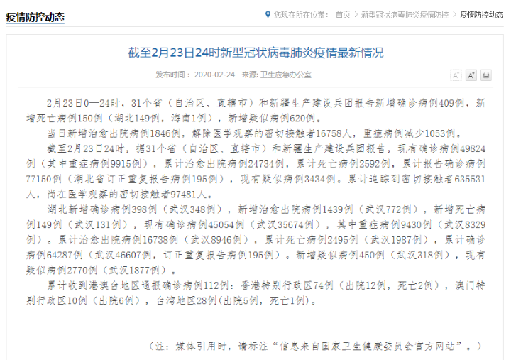 2月23日0—24时,31个省(自治区、直辖市)和新疆生产建设兵团报告新增确诊病例409例,新增死亡病例150例(湖北149例,海南1例),新增疑似病例620例。