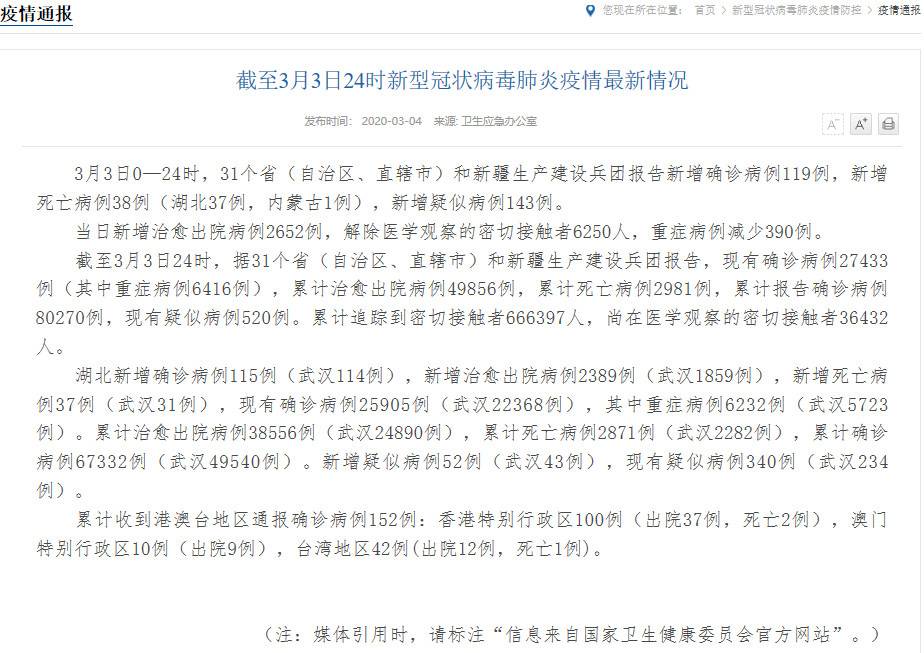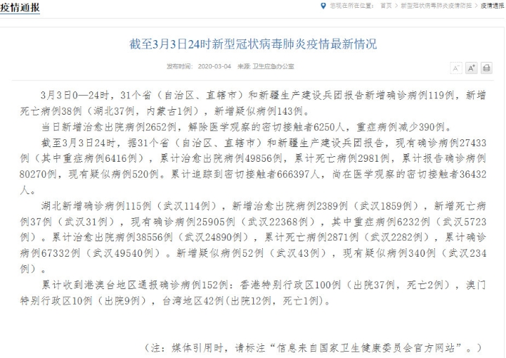3月3日0—24时,31个省(自治区、直辖市)和新疆生产建设兵团报告新增确诊病例119例,新增死亡病例38例(湖北37例,内蒙古1例),新增疑似病例143例。
