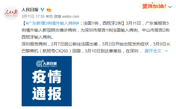 11日,广东新增3例境外输入病例(其中,中山2例深圳1例)。