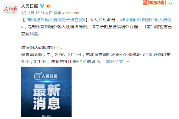 郑州市确诊1例境外输入新冠肺炎病例,该病例是郑州首例境外输入性确诊病例。