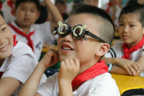 学生通过验光镜体验近视的感觉