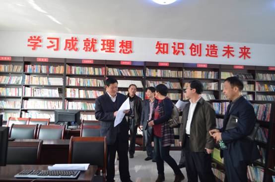 李守海主席(左一)、贵学军副主任(右二)参观方家巷社区科普图书室