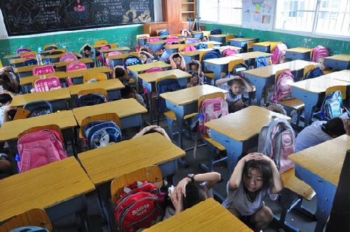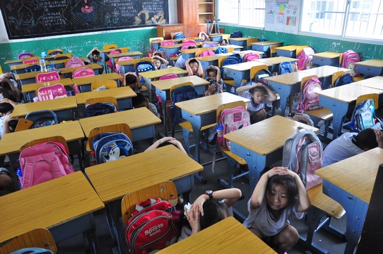 校方事先通过校园广播强调了防震演习的一些注意事项。9时40分,伴随着地震警报的响起,演习正式开始。老师带着学生有序撤离教学楼,并用手护住脖子,向操场跑去。整个过程紧张有序,学生们把刚才听到的地震安全知识,运用到了具体的实践操作当中。