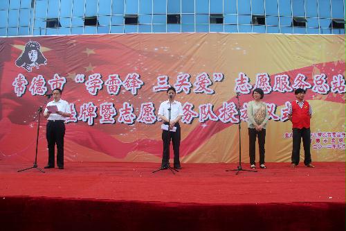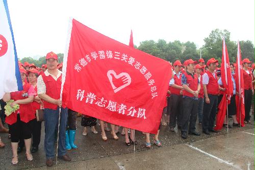 7月19日,常德市“学雷锋、三关爱”服务总站挂牌暨志愿服务队授旗仪式在市体育中心举行,市委副书记宋冬春为常德市志愿服务总站授牌,市志愿服务总队长向美华为青年志愿者、党员志愿者、科普志愿者等10个志愿服务分队授旗。市科协副主席文善武同志接过科普志愿者分队旗帜,标志着科普志愿者分队的正式成立。
