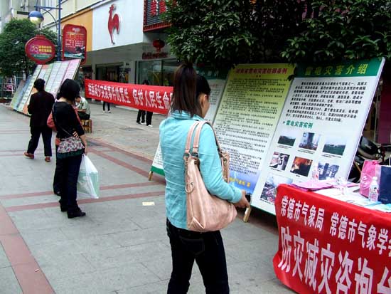 为搞好今年“防灾减灾日”宣传活动,学会制定了详细的活动实施方案,在市局大门口设立二块防灾减灾宣传盾牌,并重新做了6块新的《气象防灾应急知识》和《湖南省防雷管理条例》宣传盾牌,制作“预防减少突发事件的发生、保护人民生命财产安全”的宣传横幅,向市民发放《湖南省气象灾害应急预警信号及防护指引》科普书籍500本,并解答市民提出的一些疑难问题。