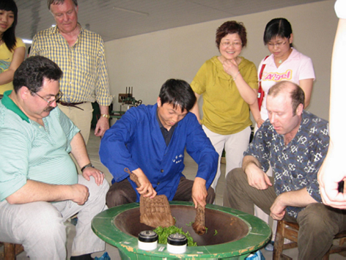 基地农艺师秦国杰(中)与德国、俄罗斯茶叶专家及贸易代表共同研讨加工“冠云春芽”新技术