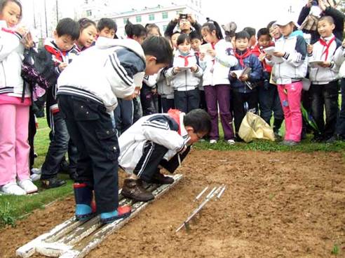 常德市北正街小学生两名小学生正在观察地表温度