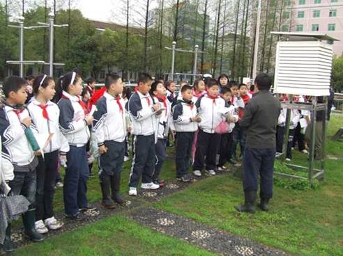 在气象科技人员的带领下,学生们兴致勃勃地参观了观测场、气象台、防雷中心、气象影视制作中心等。气象科技人员现场向同学们详细介绍了观测气象的仪器、天气预报的制作方法、雷电防护等气象知识,并手把手地教同学们如何观测气象。